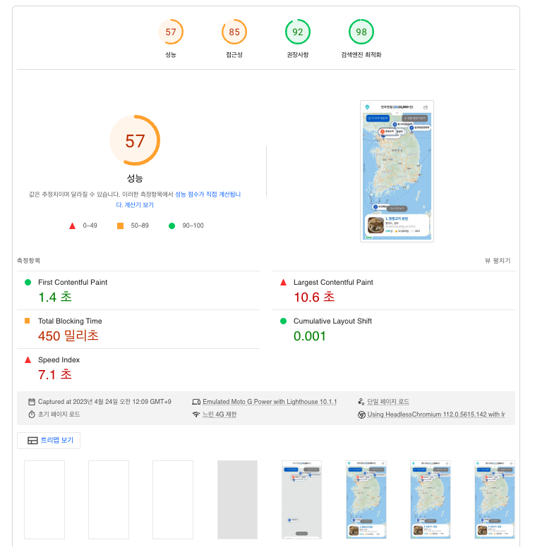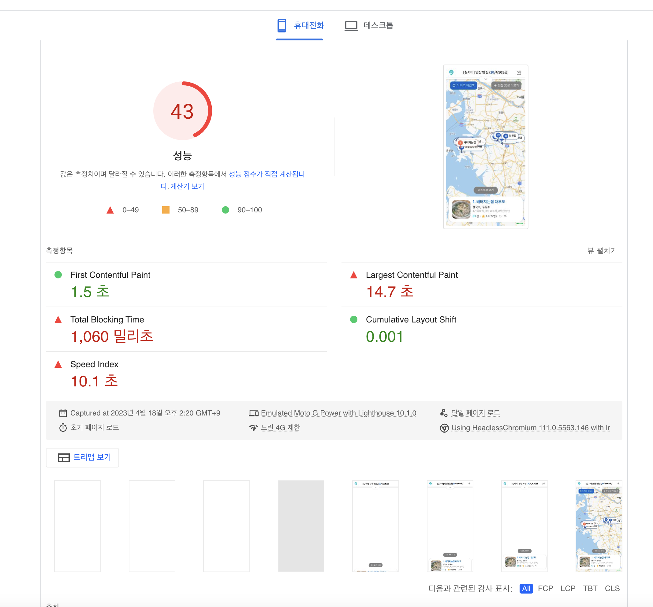 실제로 어떻게 개선이 되었나 page speed insights 를 통해 측정해보았습니다.