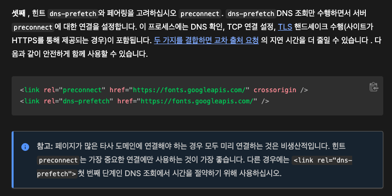 preconnect 는 http 통신을 하기 위한 TCP 연결 및 TLS(HTTPS 경우) 설정을 미리 수행하도록 지시합니다.