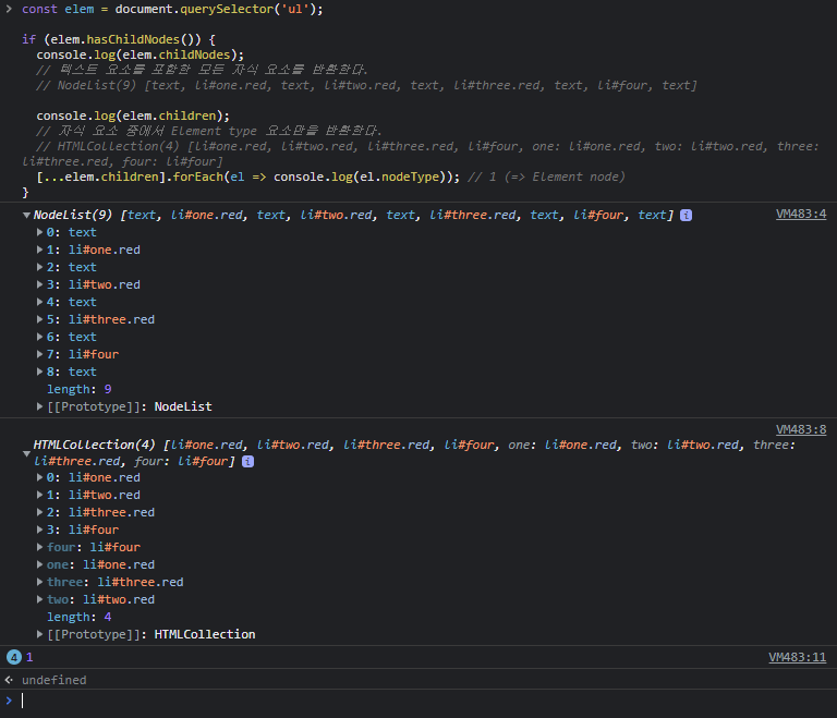 // NodeList(9) [text, li#one.red, text, li#two.red, text, li#three.red, text, li#four, text]