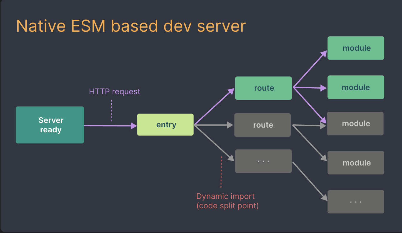 Vite 는 Native ESM (ESModule) 을 사용해 소스코드를 제공합니다. 이는 브라우저가 번들러 작업의 일부를 가지도록 합니다. Vite 는 브라우저가 요청하는 대로 소스코드를 변환하고 제공하기만 하면 됩니다. 조건부 동적 import 이후의 코드는 현재 화면에서 실제로 사용되는 경우에만 처리됩니다.