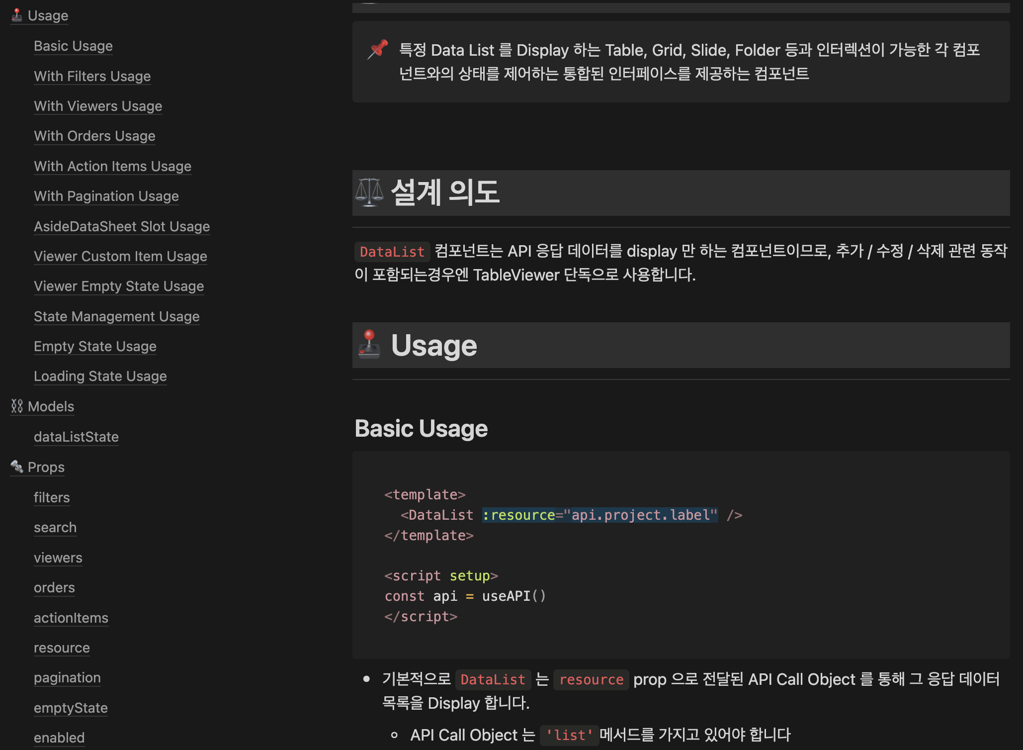 그래서 투입 이후에는 Source Of Truth 에 많이 신경을 썼다. 디자인팀에 컴포넌트 스펙에 대한 문서화를 하는데 시간을 많이 들였다. 부가적으로 개발팀도 컴포넌트 설계문서 작성을 같이 해가며 진행했는데, 스토리북과 더불어 아카이브 목적과 함께 UI Framework 공식문서 처럼 컴포넌트의 사용법을 작성했다. 이는 개발을 하기전에 이 컴포넌트가 어떻게 사용될것인지를 미리 정의하고 넘어가는것으로, 개인적으로는 많은 의미가 있었다고 생각한다. 어쩌면 TDD 로 개발할때 구현 요구사항을 미리 정의 해보는 의미도 있고, 설계문서와 동일하게 컴포넌트가 나오기 때문에 다른 개발자가 스토리북과 함께 참고하기 좋았다.